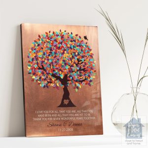 Uniquely personalized colorful spring tree copper 7th anniversary gift for couple, wedding and other celebratory occasions, featuring the depicted colorful tree perfect marriage quote. Create a deeply personal gift for any couple or husband and wife with your personalized names, date and text. Alternatively, this design may also be customized for an acquaintance celebratory gift, wedding or completely custom events. Anything’s possible!