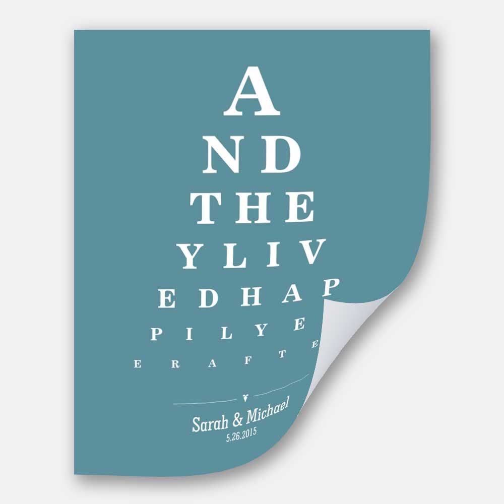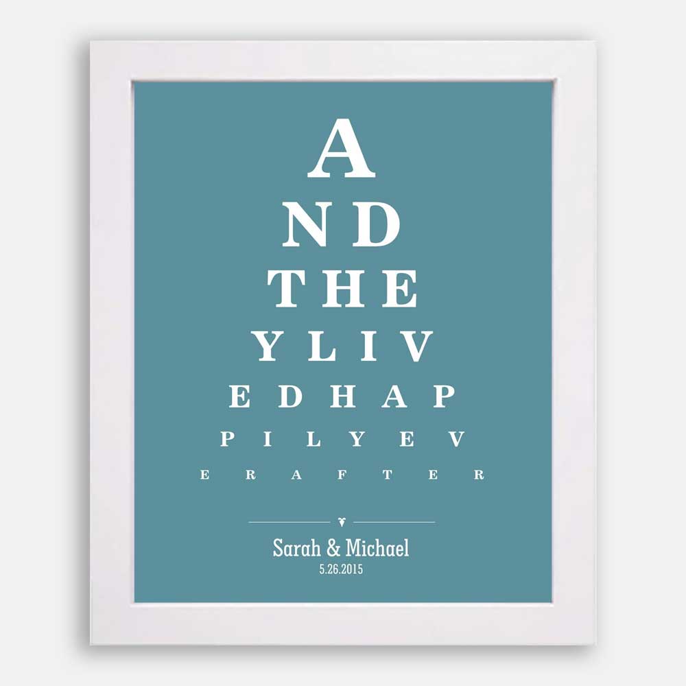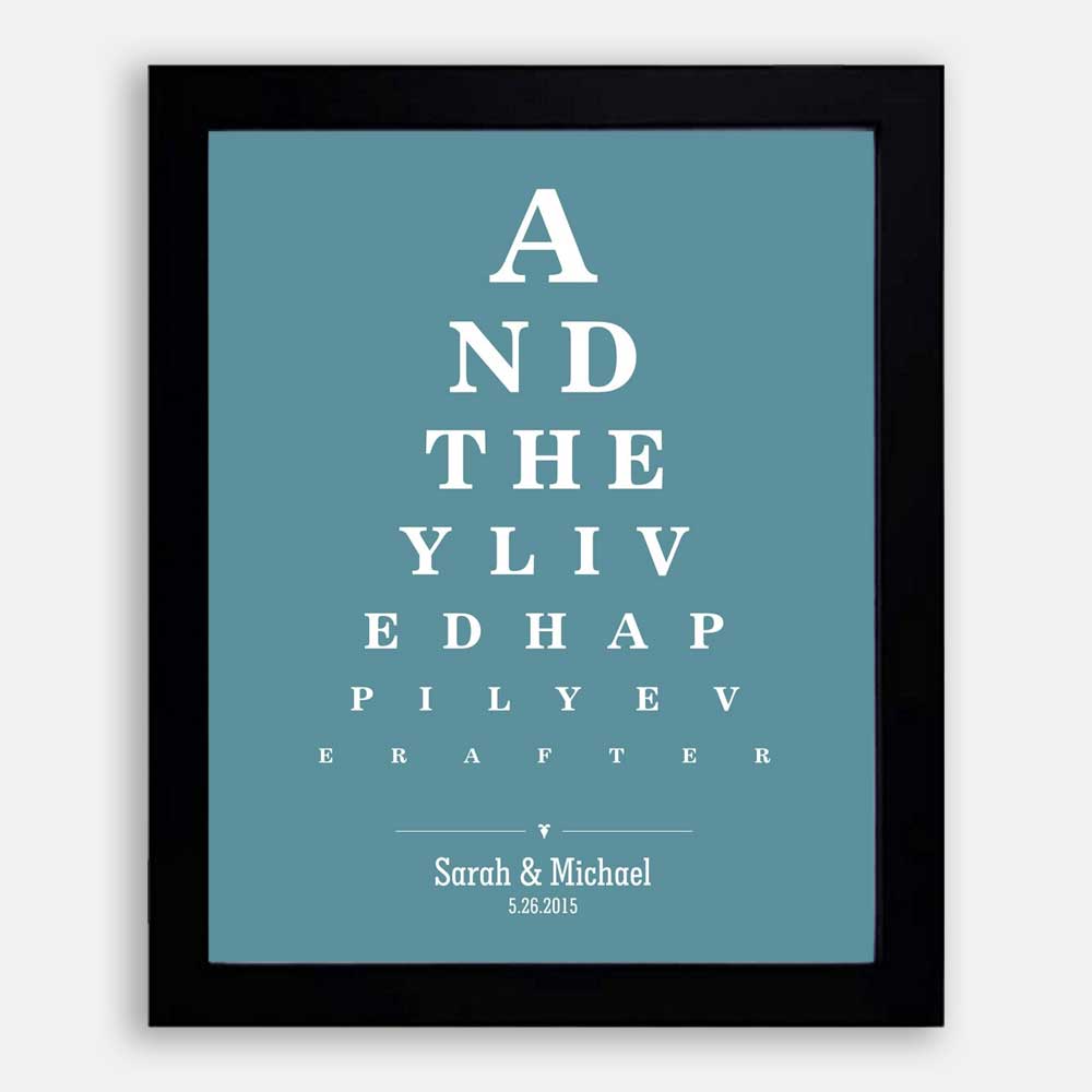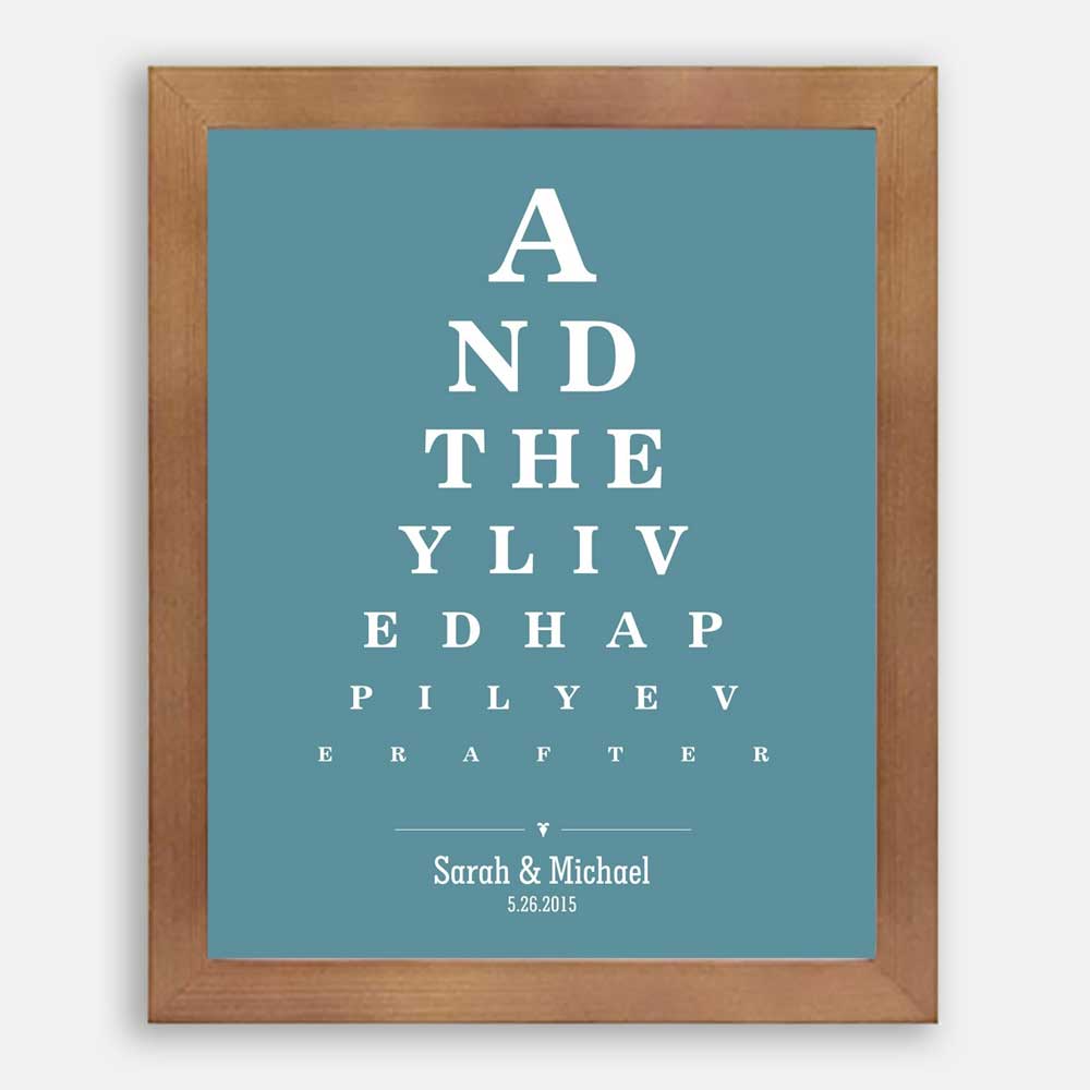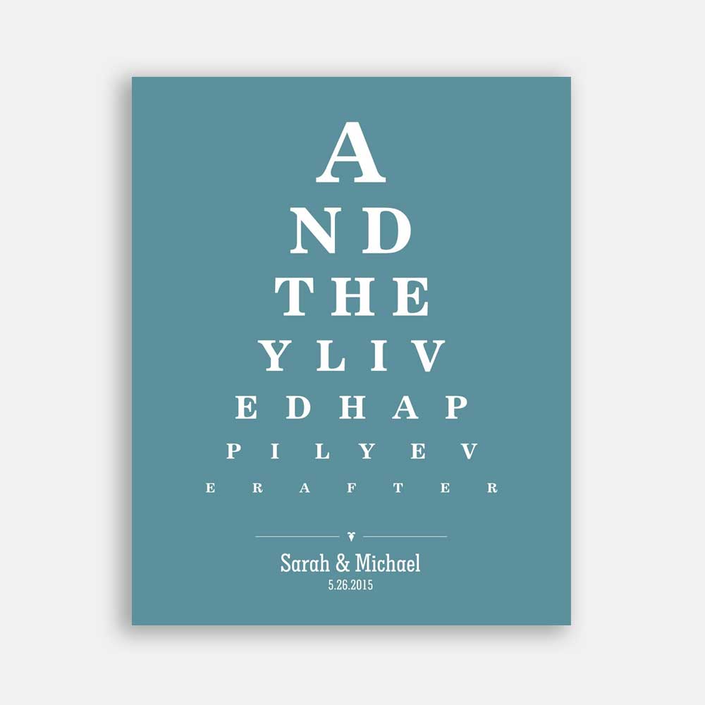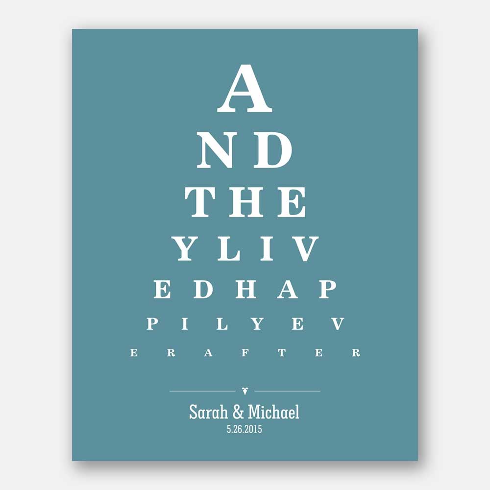 Couple And They Lived Happily Ever After Word Design Eye Chart on Blue Background Custom Metal Tin Wedding Art Print #CWA-1274