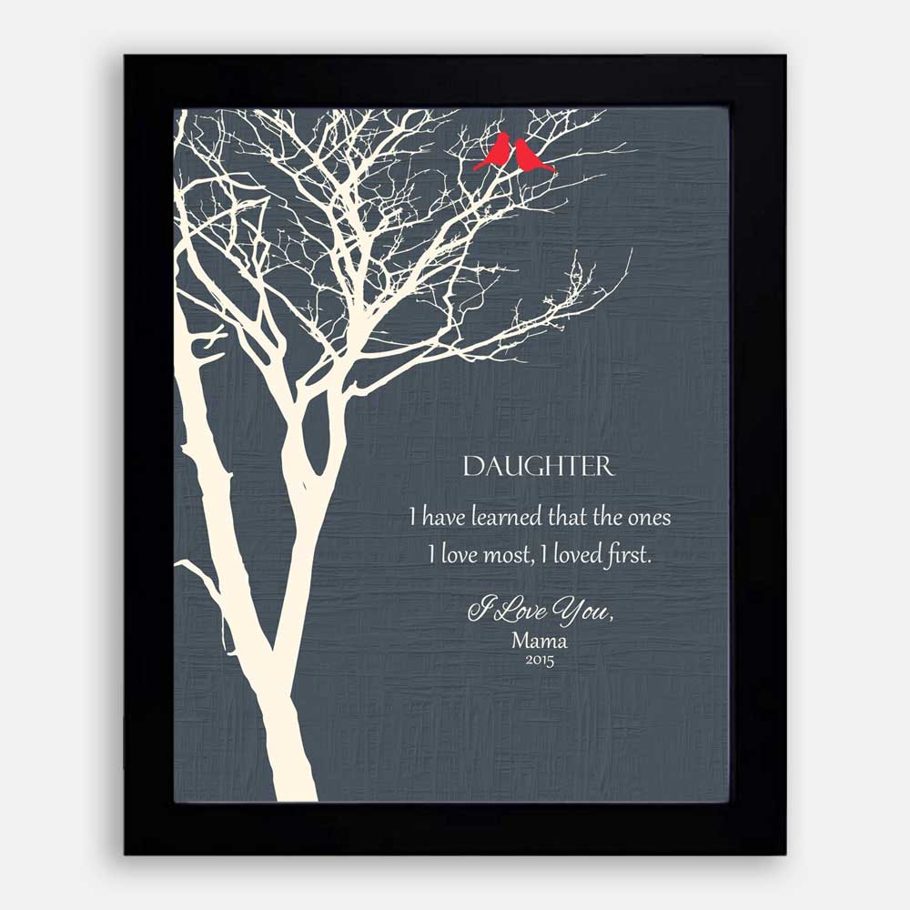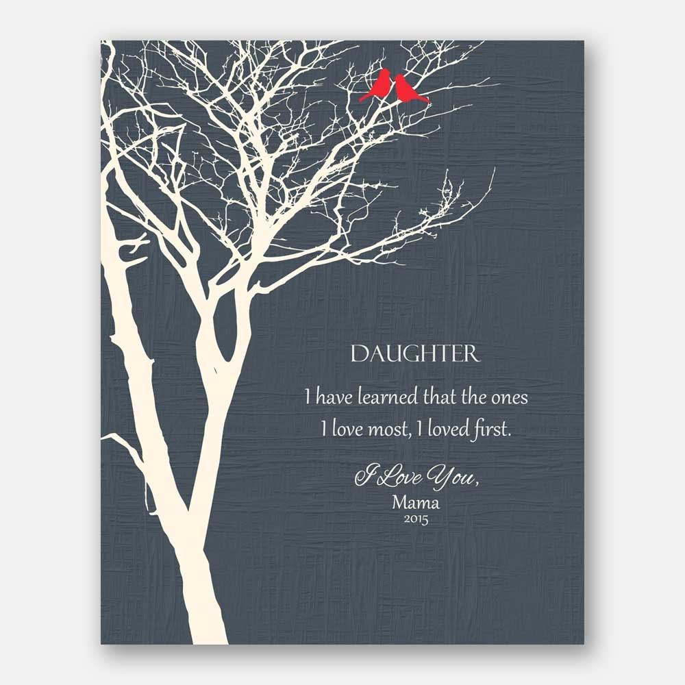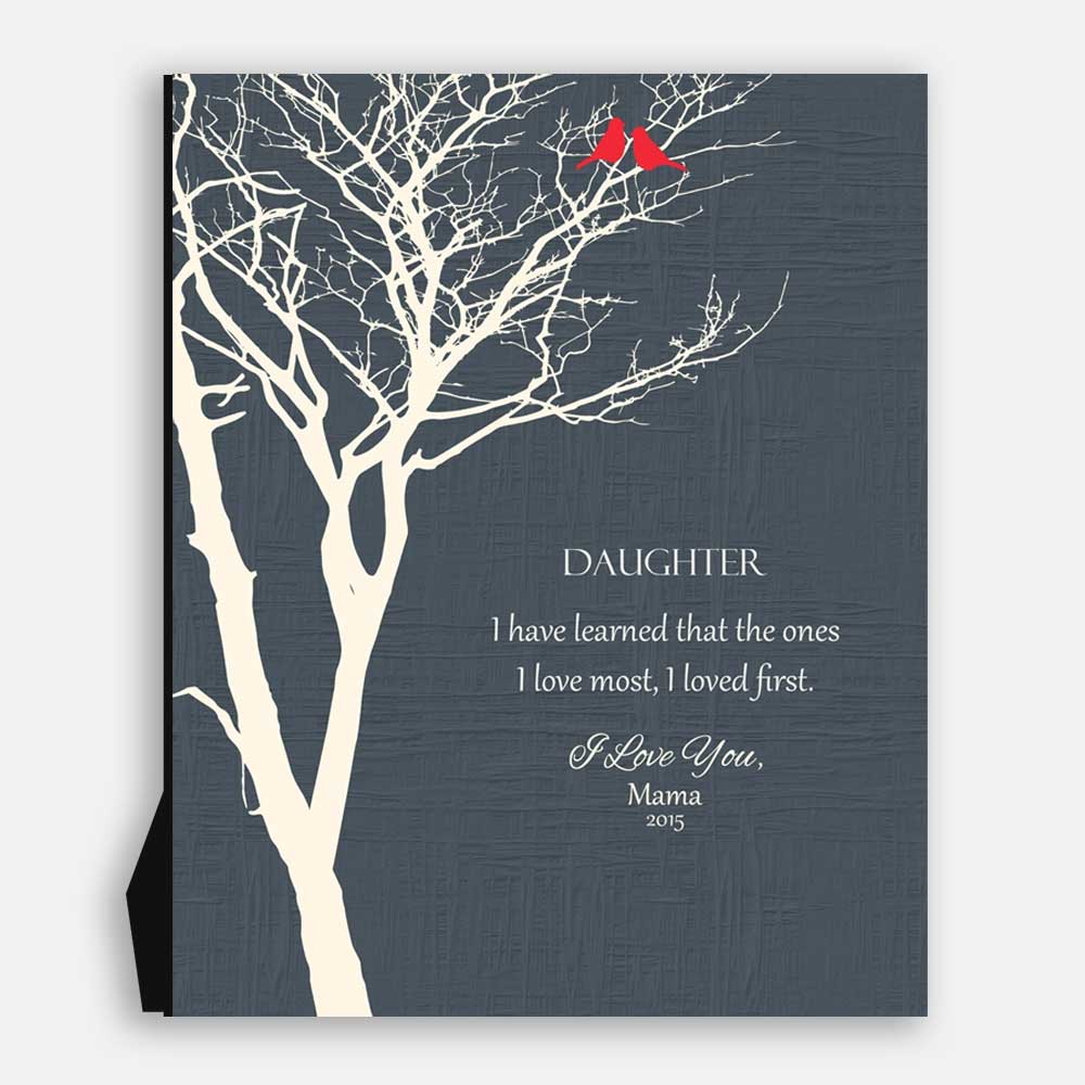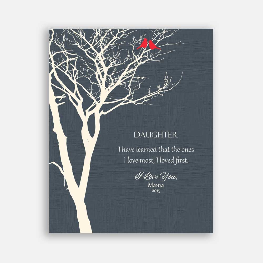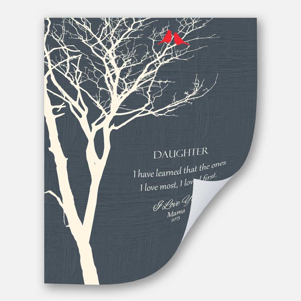 Daughter From Mom and Dad I Have Learned The Ones I Love Most Coral Birds on Faux Blue Texture Bare Tree #CWA-1110