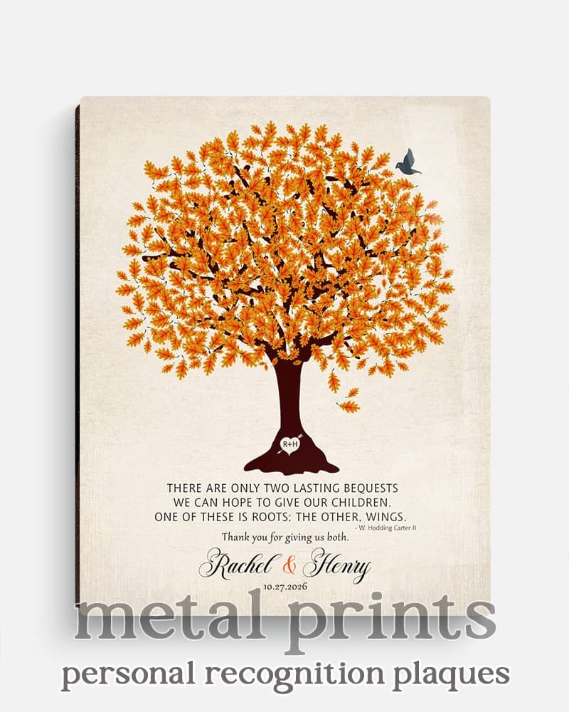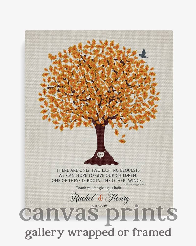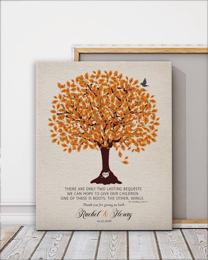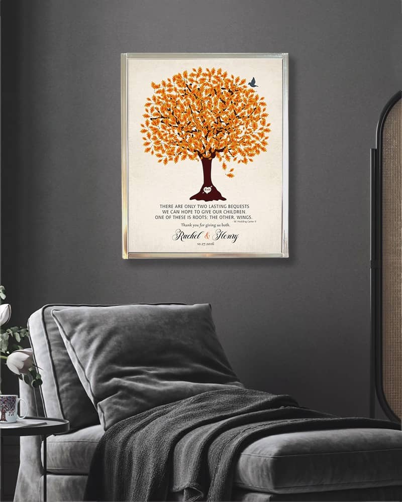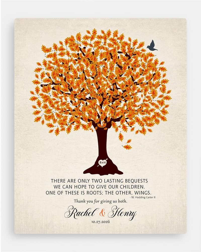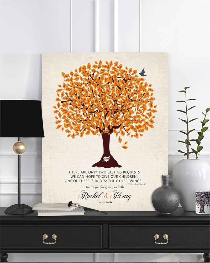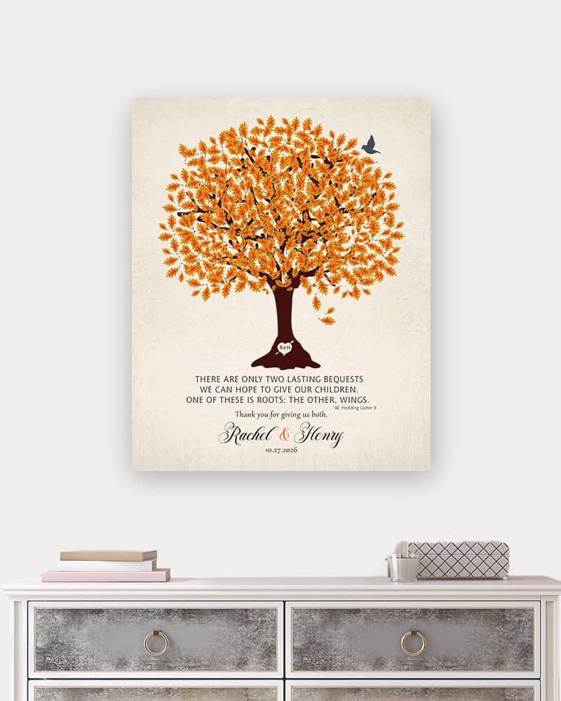 Show deep appreciation for your new mother in law with this traditional and personalized wedding gift that will always make her think of you. Featuring an orange oak tree on linen, this sentimental gift of gratitude for an amazing parents will be the highlight of their home, keeping you forever close to mind and heart.