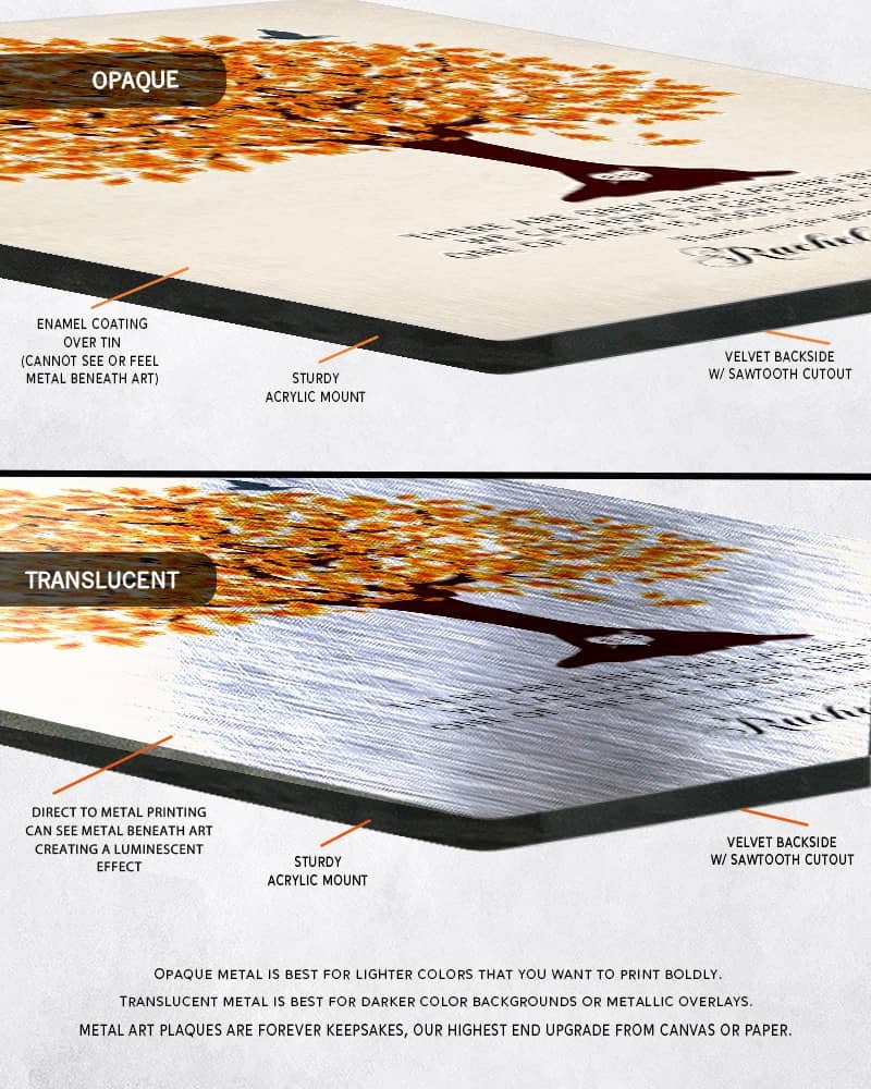Metal Art Plaques – Permanent commemoration keepsakes to be treasured for a lifetime. This design is printed with a linen overlay directly onto an opaque finished metal panel. We then mount your metal panel onto a sturdy acrylic base, with a plush velvet backside and a sawtooth cutout for hanging. Approx. 1/4 inch in depth.