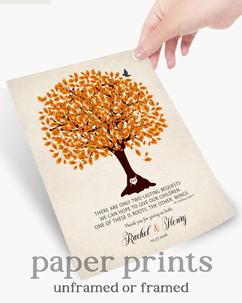 This sentimental personalized art print for parents highlights an orange oak tree on linen and makes an ideal wedding gift to express your sincere gratitude for their participation and blessings. Printed on your choice of mediums for paper prints, gallery wrapped canvas, or stunning metal plaques.Try before you buy! Visit this design’s editing page here: https://luckytusk.comlt-1101 to see how easy it is to personalize this artwork with your own text and color choices. You can begin editing at any time and save your designs as you go. After completing your purchase on Etsy, you will be able to submit your finished artwork through a non-pay checkout to send it right into production. You’ll be notified and updated every step of the way, from production to delivery.